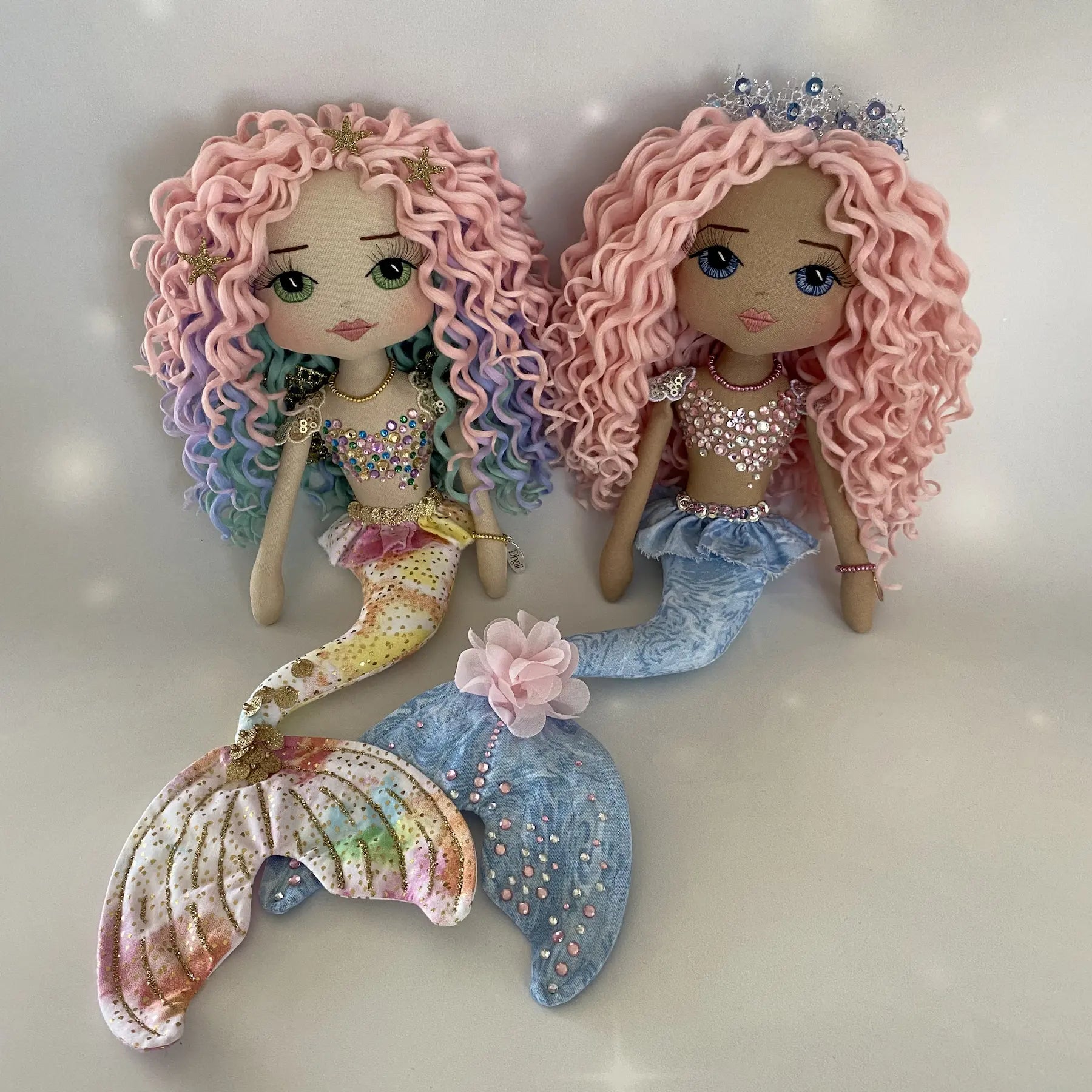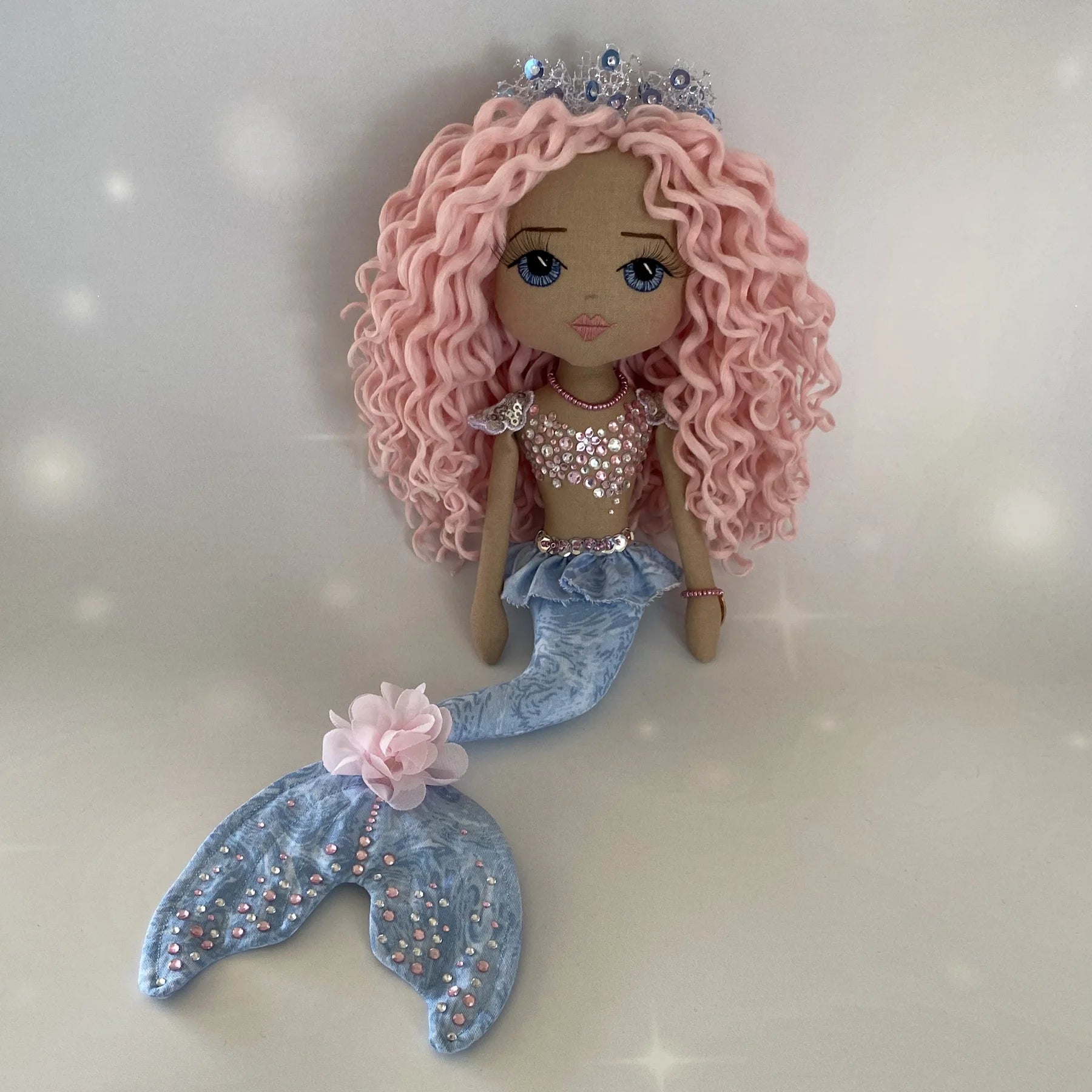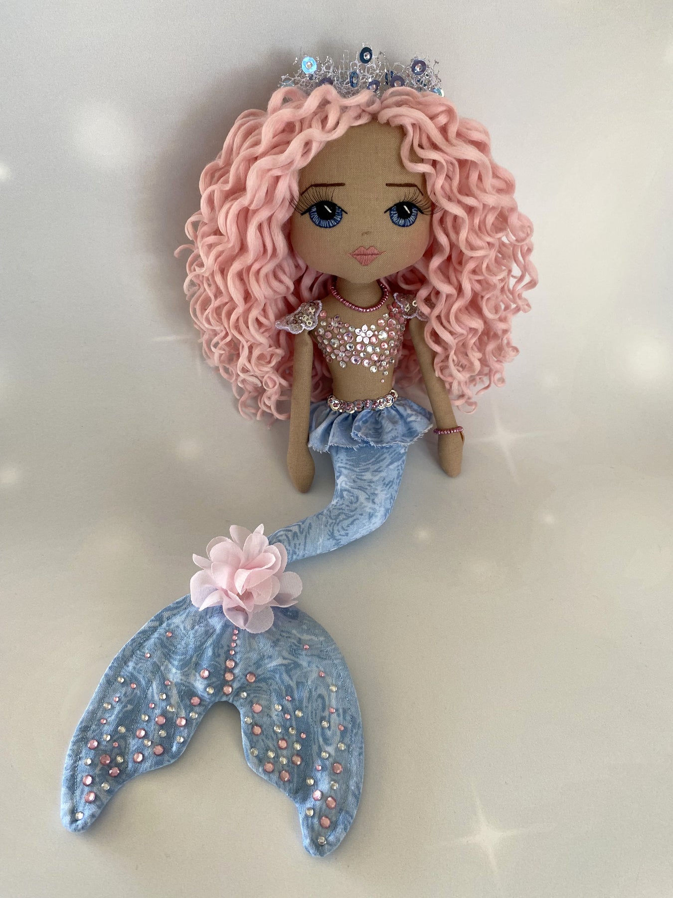• Individually hand-rolled pastel-pink curls as soft as salt-kissed waves, gently crowned with a silver and blue mermaid tiara